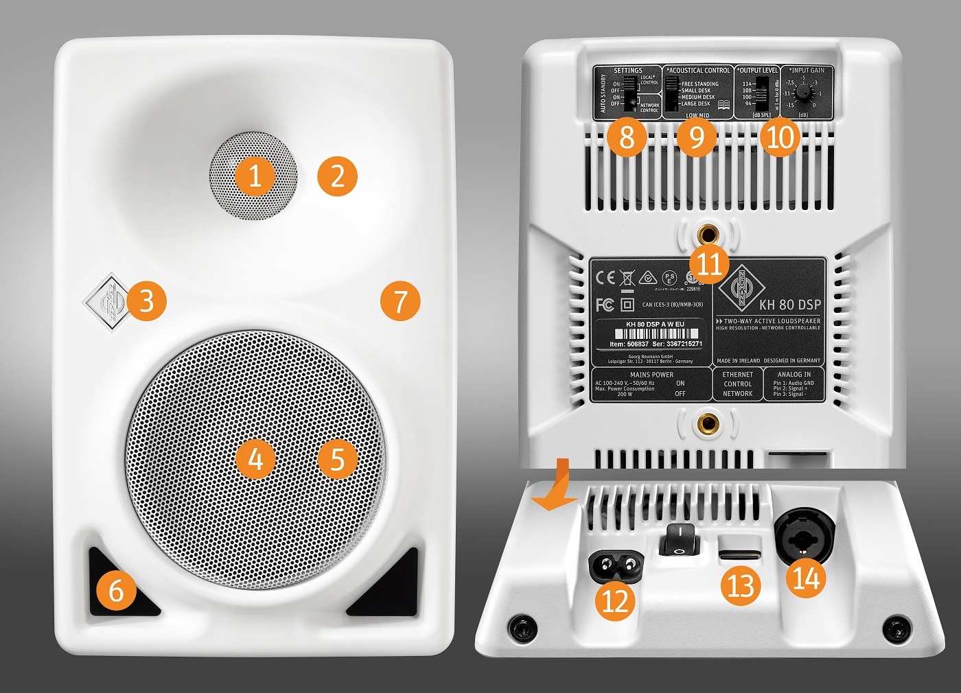 The KH 80 DSP has also been developed true to the Neumann philosophy for monitor loudspeakers. Every component, every shape, every signal and every wave motion is a consequence of this philosophy. No form or component is there without reason. There are hundreds of tangible reasons built into the KH 80 DSP, which all stand for exceptionally pure and neutral sound. These include, for example, curvatures of the housing that reduce edge diffraction. Also included is the pistonic output of the bass driver which does not give rise to harmonic distortions, even with the highest sound peaks. Some of these reasons are obvious in the KH 80. Others Neumann prefers to keep to itself. But together, each can be heard – sound professionals in both large and small studios all around the world can testify to this. You can read more about the Neumann philosophy for studio monitors here.